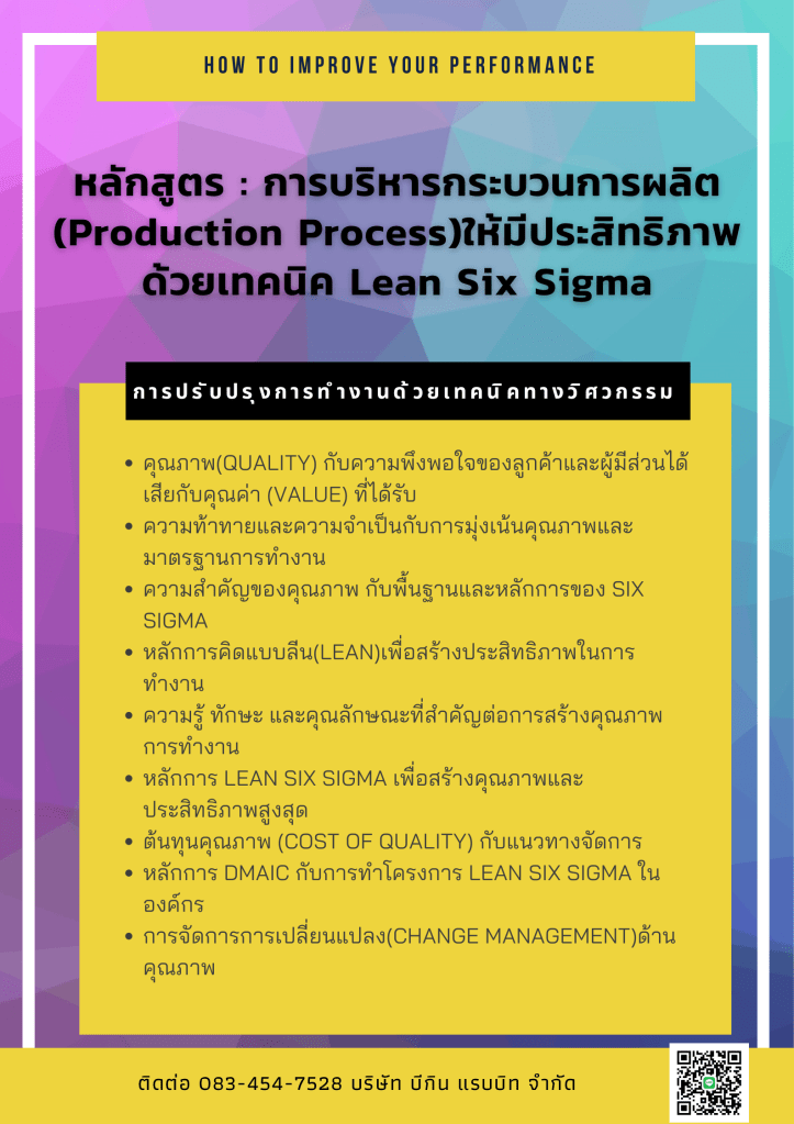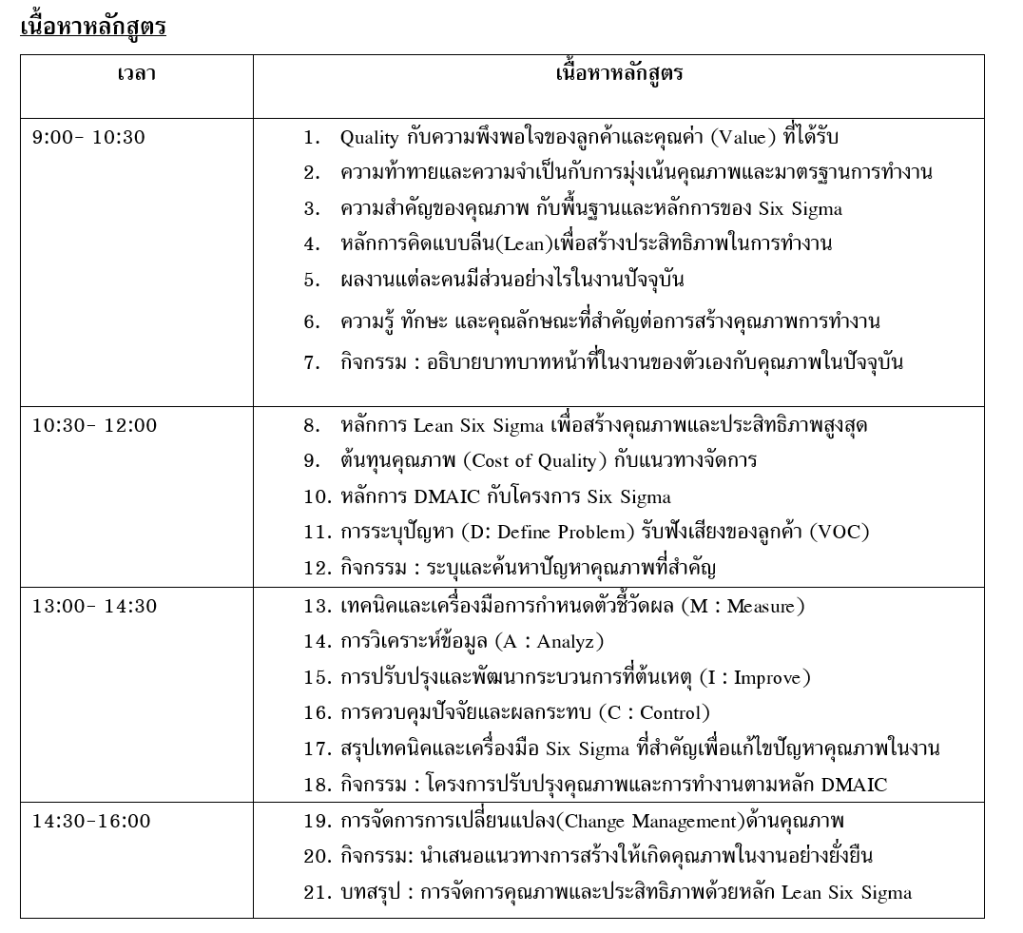 โปรแกรมการฝึกอบรมได้ออกแบบมาให้ผู้เข้าร่วมได้เรียนรู้กับพื้นฐานของการสร้างมาตรฐานคุณภาพด้วยหลักการ Six Sigma และสามารถนำความรู้ไปประยุกต์ใช้ให้เกิดคุณภาพอย่างต่อเนื่องในกระบวนการทำงานของตัวเองได้ และแนวคิดเพื่อช่วยการตอบสนองและสร้างคุณค่า(Value)อย่างมีประสิทธิภาพด้วยหลักการคิดแบบ Lean ด้วยการอบรมแบบมีส่วนร่วมผู้เข้าอบรมจะได้เรียนรู้เครื่องมือ ทักษะที่จำเป็นและกรอบความคิดที่สำคัญ(Knowledge & Skills & Mindset) ในการขับเคลื่อนให้เกิดการปรับปรุงกระบวนการและคุณภาพของสินค้าให้มีความเป็นเลิศทางธุรกิจได้อย่างต่อเนื่องและยั่งยืน
