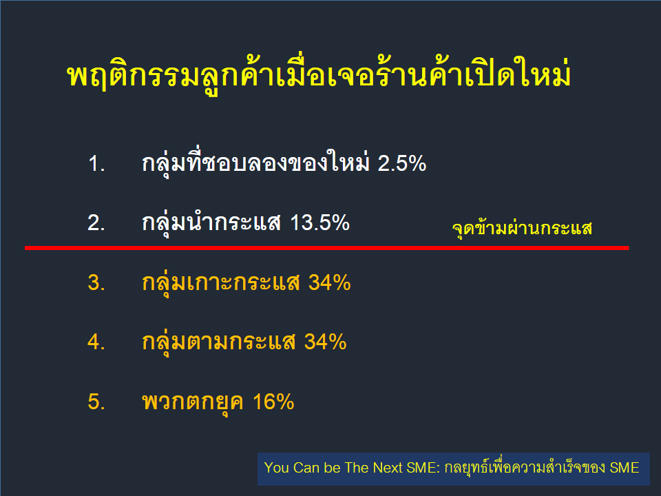 จะเห็นได้ว่ากว่าร้านของเราจะเป็นกระแสได้ต้องผ่าน คนส่วนน้อย ถึง 2 กลุ่ม คือ กลุ่มชอบลองและกลุ่มนำกระแส ซึ่งมีจำนวนอยู่ประมาณ 15%