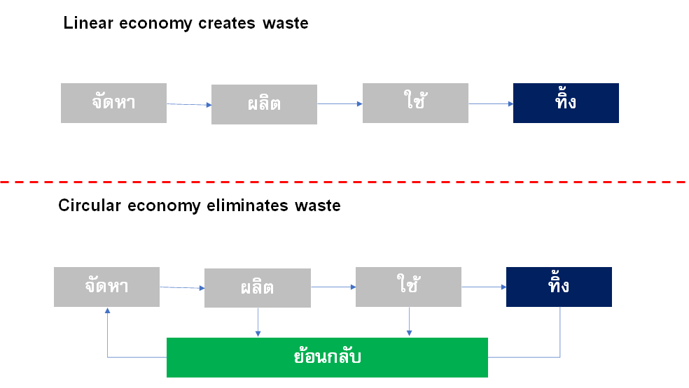 ในขณะที่ธุรกิจส่วนใหญ่ยังคงมองการขับเคลื่อนไปข้างหน้าแบบเป็นเส้นตรง(Linear Economy) คือ เริ่มจากต้นน้ำ(วัตถุดิบ) กลางน้ำ(ผลิต) และปลายน้ำ(ผู้บริโภค) ตลอดทั้งกระบวนการของซัพพลายเชน และจบกระบวนการที่ผู้บริโภคทิ้งแล้วจบกัน แล้วมาเริ่มการจัดซื้อวัตถุดิบใหม่ ผลิตใหม่ และขายใหม่