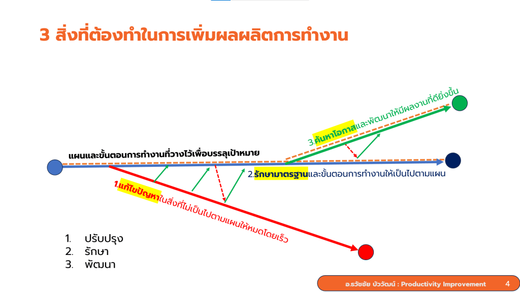 เพราะถ้าพนักงานทุกคนที่อยู่หน้างานของตัวเอง สามารถทำงานทั้ง 3 สิ่งนี้ได้ตัวเองในเบื้องต้นก็จะสามารถจัดการงานของตัวเองได้อย่างมีประสิทธิภาพ และถ้าองค์กรไหนสามารถสร้างพนักงานให้ทำสิ่งนี้ได้จนเป็นนิสัย และกลายเป็นวัฒนธรรมองค์กร ไม่ได้ยึดติดที่ตัวบุคคล ก็จะทำให้องค์กรนั้นมีการพัฒนาอย่างต่อเนื่องและยังยืนได้