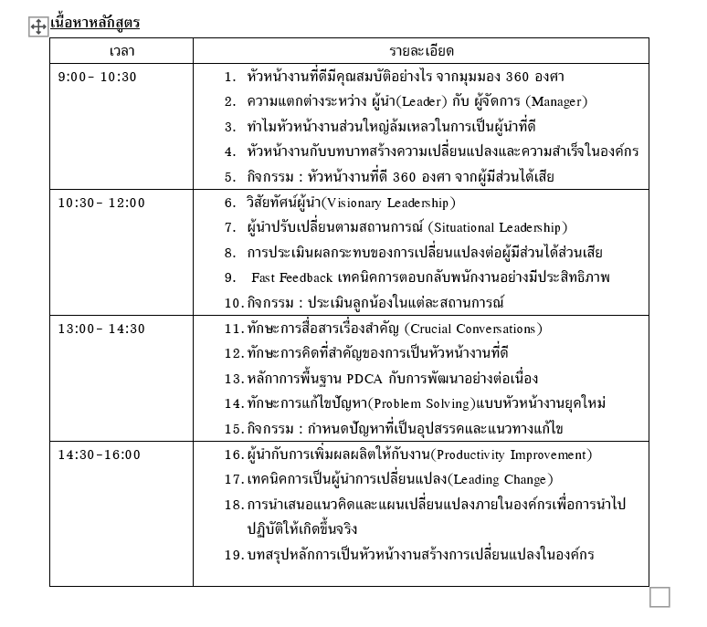 ความเข้าใจในบทบาทของหัวหน้างานที่ดี การตอบสนองผู้บังคับบัญชาและผู้มีส่วนได้เสีย ด้วยหลักพื้นฐานของการเป็นผู้นำตามสถานการณ์ หัวหน้างานที่มีวิสัยทัศน์ และผู้นำการเปลี่ยนแปลงเพื่อขับเคลื่อนทีมงานไปสู่เป้าหมาย ทั้งการวางแผนและการจัดเตรียมทรัพยากรที่จำเป็นในการบริหารระหว่างการเปลี่ยนแปลง การสื่อสารที่มีประสิทธิภาพ ความเป็นผู้นำ และทักษะในการแก้ปัญหาเพื่อเอาชนะอุปสรรคปัญหา มีความสามารถในการปรับตัวและยืดหยุ่นเมื่อเผชิญอุปสรรค รวมถึงรักษาและพัฒนาความสำเร็จให้เกิดขึ้นได้อย่างยั่งยืน ทั้งหมดถูกบรรจุอยู่ในเนื้อหาการฝึกอบรม เพื่อให้เกิดความเข้าใจและสามารถนำไปประยุกต์ใช้ให้เกิดความร่วมมืออย่างแท้จริง ช่วยเปลี่ยนแปลงหัวหน้างานธรรมดาให้กลายเป็นผู้นำที่สร้างความสำเร็จให้ในแต่ละส่วนงานได้อย่างมีประสิทธิภาพเพื่อไปสู่ผลงานที่ดีกว่าเดิม